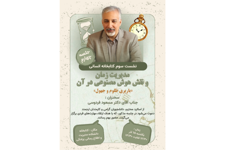 جلسه پنجم از نشست «کتابخانه انسانی» با روایت جناب آقای دکتر مسعود فردوسی و موضوع «مدیریت زمان و نقش هوش مصنوعی در آن» و بیان نظرات جمعی از اساتید، کارمندان و دانشجویان دانشکده به صورت تعاملی روز یکشنبه 30 آذر ماه 1404 ساعت 12:30 تا 13:45در محل کتابخانه دانشکده برگزار گردید. رئوس مطالب ارائه شده در این نشست به شرح زیر بود.