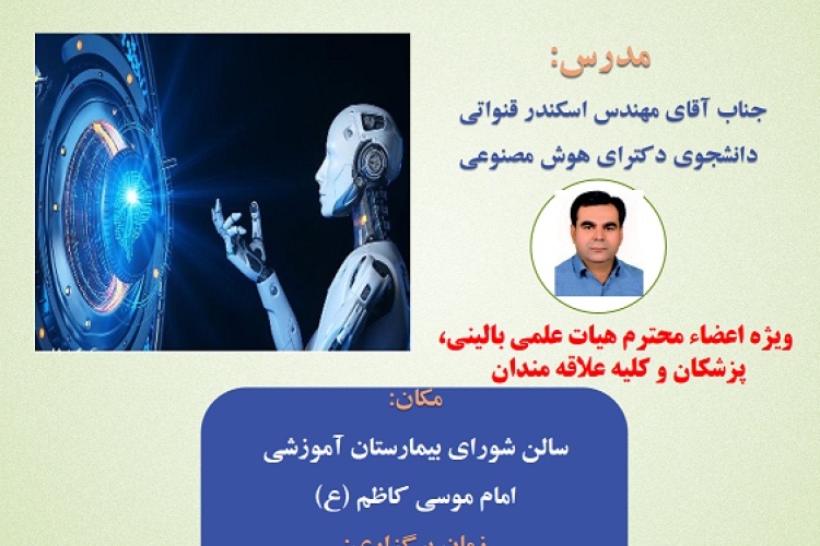 بدینوسیله به اطلاع اعضا محترم هیات علمی، پزشکان و علاقه مندان می رساند کارگاه آموزشی با عنوان "هوش مصنوعی در جراحی و پزشکی نوین" مورخ 5 مهرماه در محل سالن شورای مرکز آموزشی درمانی امام موسی کاظم برگزار می گردد.