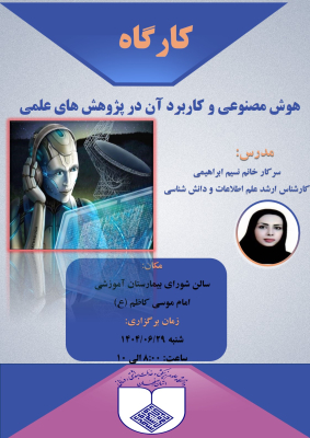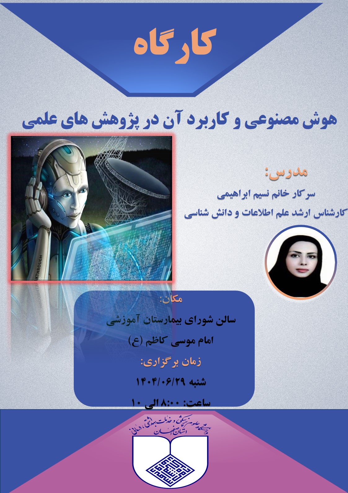 بدینوسیله به اطلاع اعضا محترم هیات علمی و علاقه مندان می رساند کارگاه آموزشی با عنوان "هوش مصنوعی و کاربردهای آن در پژوهش های علمی" 29 شهریور ماه در محل سالن کنفرانس مرکز آموزشی درمانی امام موسی کاظم برگزار می گردد.