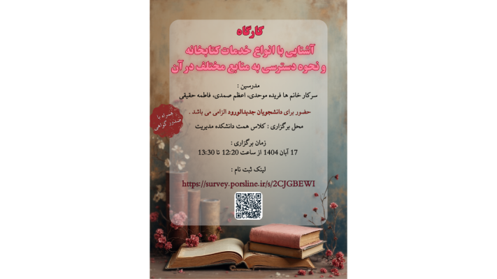اطلاع رسانی کارگاه «آشنایی با انواع خدمات کتابخانه و نحوه دسترسی به منابع مختلف در آن»