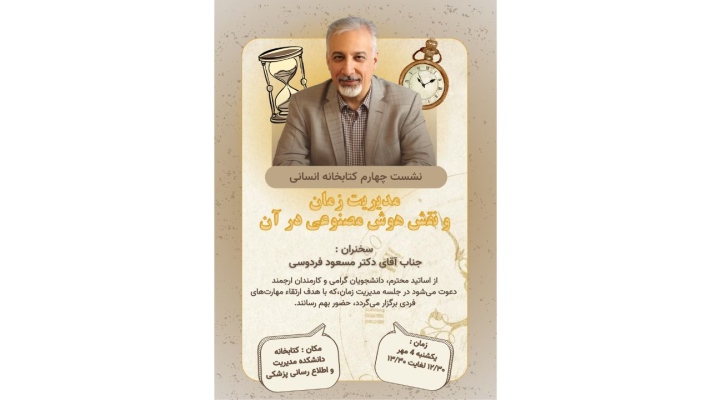 نشست چهارم کارگاه «کتابخانه انسانی» با سخنرانی جناب آقای دکتر مسعود فردوسی و موضوع «مدیریت زمان و نقش هوش مصنوعی در آن» و بیان نظرات جمعی از اساتید، کارمندان و دانشجویان دانشکده به صورت تعاملی روز یکشنبه 4 آبان ماه 1404ساعت 12:30 تا 13:30در محل کتابخانه دانشکده برگزار گردید. رئوس مطالب ارائه شده در این نشست به شرح زیر بود.