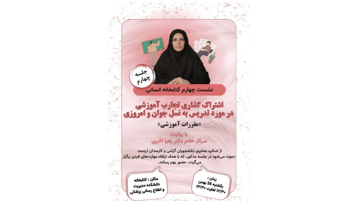 جلسه چهارم از نشست چهارم «کتابخانه انسانی» با روایت تجربه سرکار خانم دکتر زهرا اکبری در زمینه تدریس به نسل جوان امروزی و بحث و تعامل با شرکت کنندگان روز یکشنبه 26 بهمن ماه 1404 ساعت 12:30 تا 14 در محل کتابخانه دانشکده برگزار گردید. رئوس مطالب ارائه شده در این نشست به شرح زیر بود.