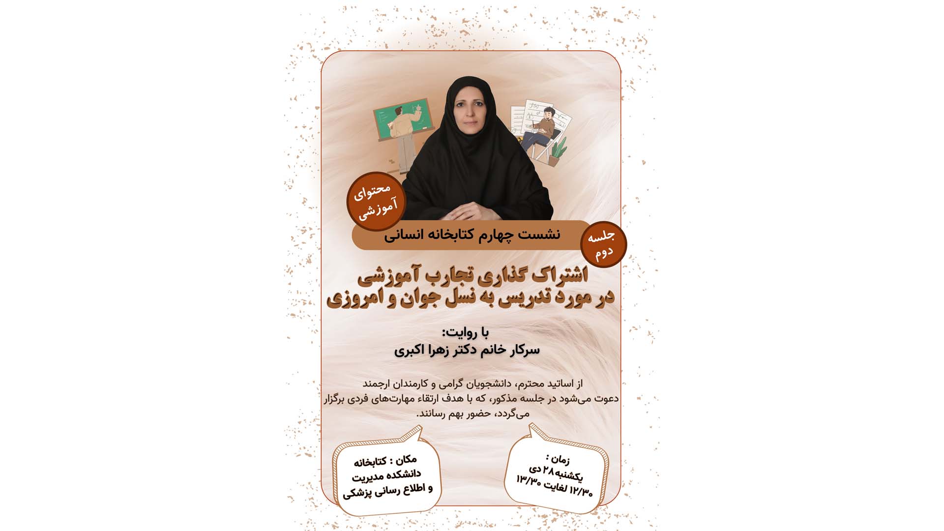 جلسه دوم از نشست چهارم «کتابخانه انسانی» با روایت تجربه سرکار خانم دکتر زهرا اکبری در زمینه تدریس به نسل جوان امروزی و بحث و تعامل با شرکت کنندگان روز یکشنبه 28 دی ماه 1404 ساعت 12:30 تا 14 در محل کتابخانه دانشکده برگزار گردید. رئوس مطالب ارائه شده در این نشست به شرح زیر بود.