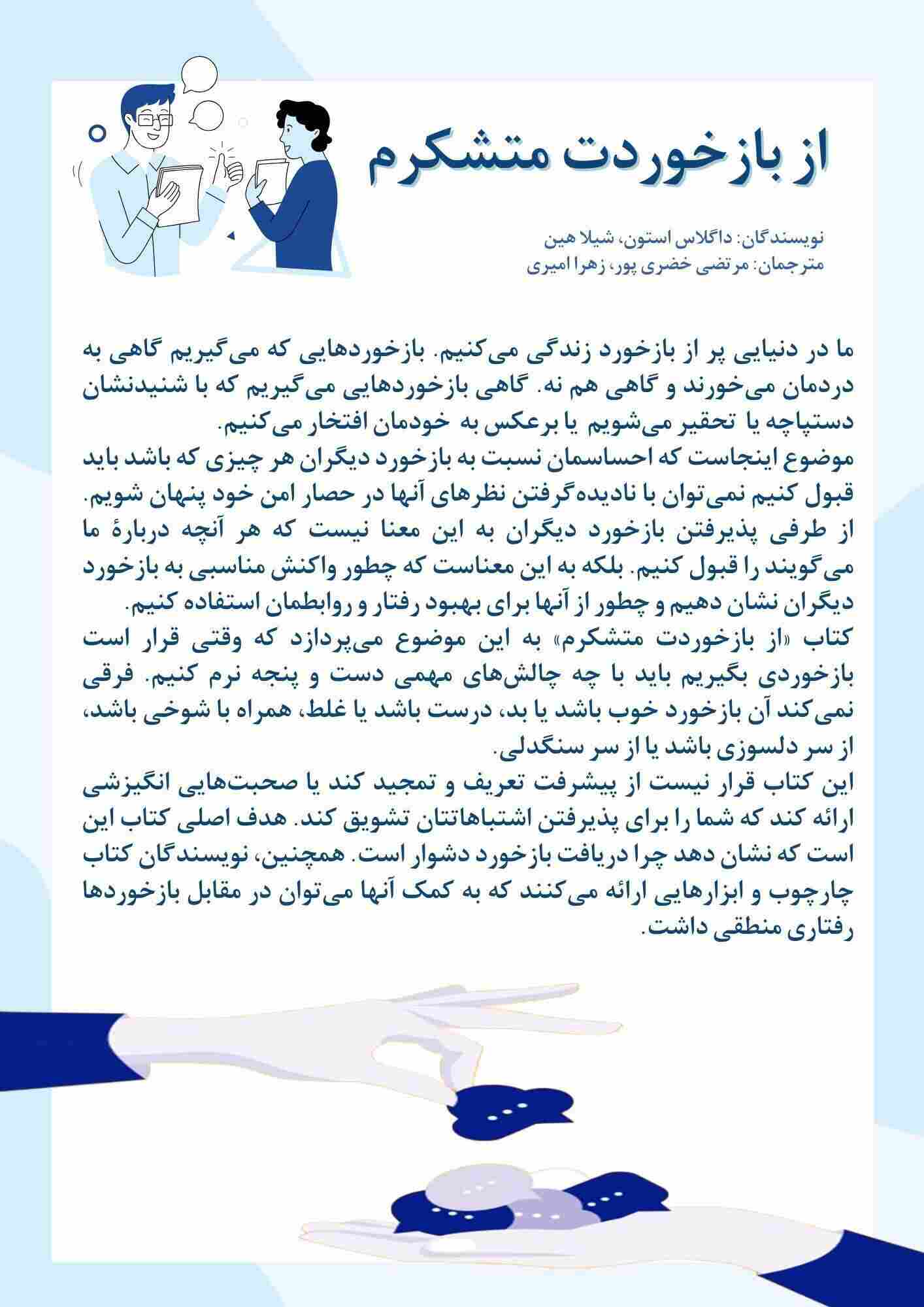 کتاب «از بازخوردت متشکرم» به این موضوع میپردازد که وقتی قرار است بازخوردی بگیریم باید با چه چالشهای مهمی دستوپنجه نرم کنیم. فرقی نمیکند آن بازخورد خوب باشد یا بد، درست باشد یا غلط، همراه با شوخی باشد، از سر دلسوزی باشد یا از سر سنگدلی.