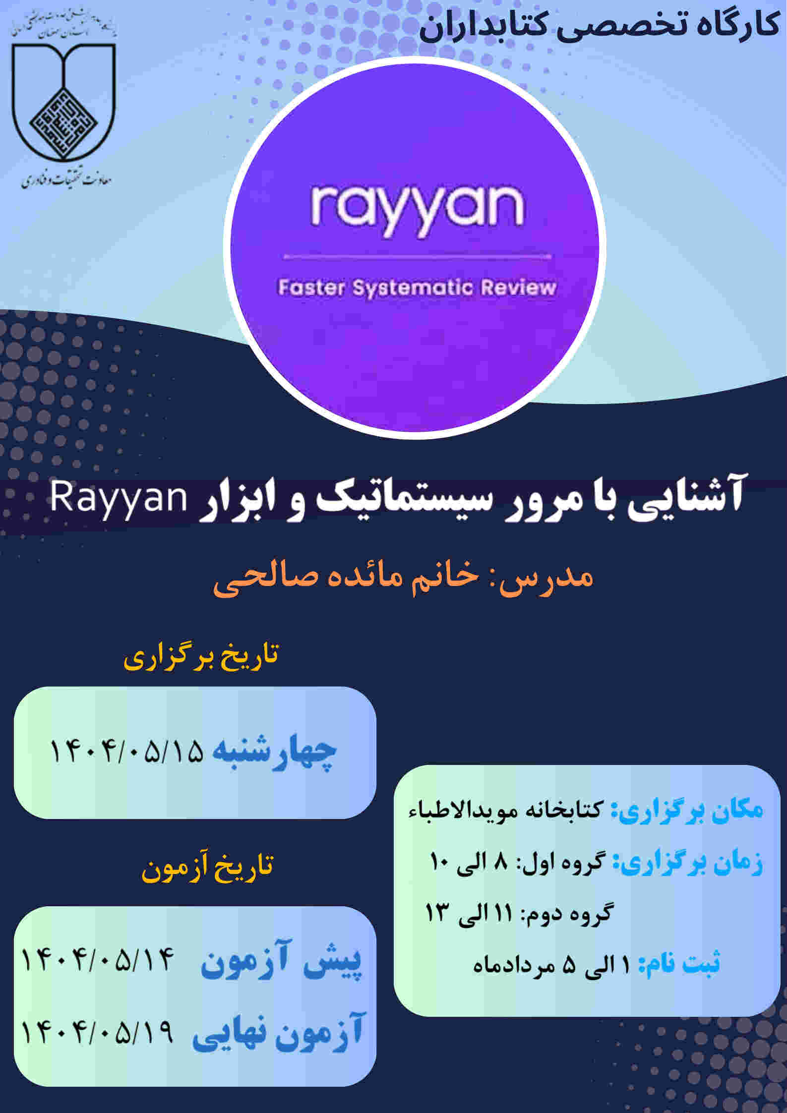 برگزاری کارگاه تخصصی کتابداران با عنوان آشنایی با مرور سیستماتیک و ابزار Rayyan برگزاری کارگاه تخصصی کتابداران با عنوان آشنایی با مرور سیستماتیک و ابزار Rayyan زمان برگزاری: 1404/05/15 مکان برگزاری: کتابخانه موید الاطبا