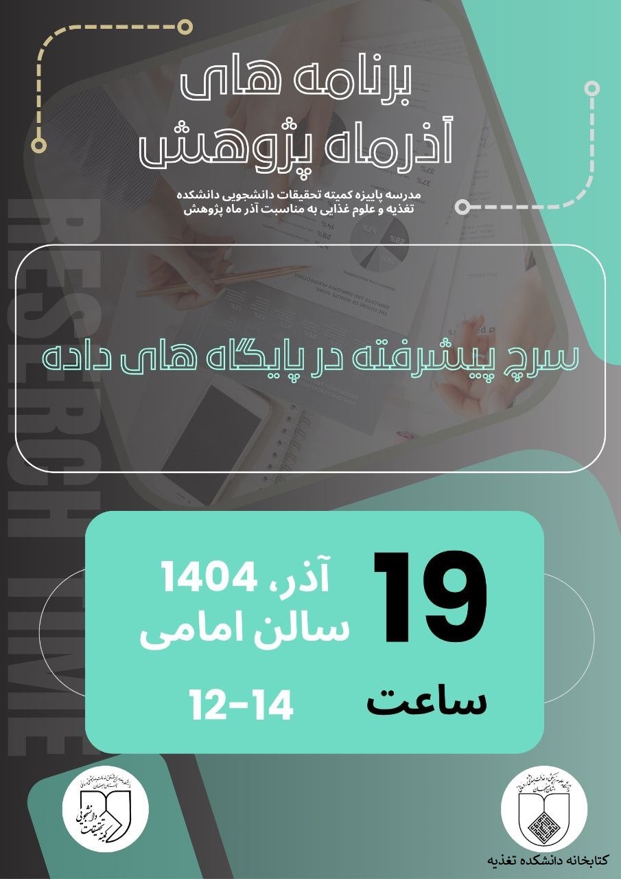 6 | وبینار جست و جوی پیشرفته در پایگاه های scopus, pubmed و web of science | 1404/09/19 | دکتر الهام حسینی | کتابخانه تغذیه | ||